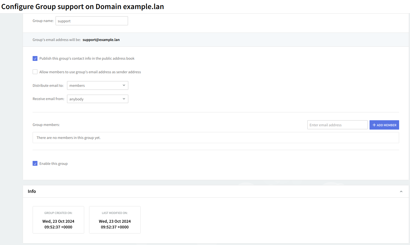The "Info" section displays details referring to the group’s creation and the group’s last modification date and time.