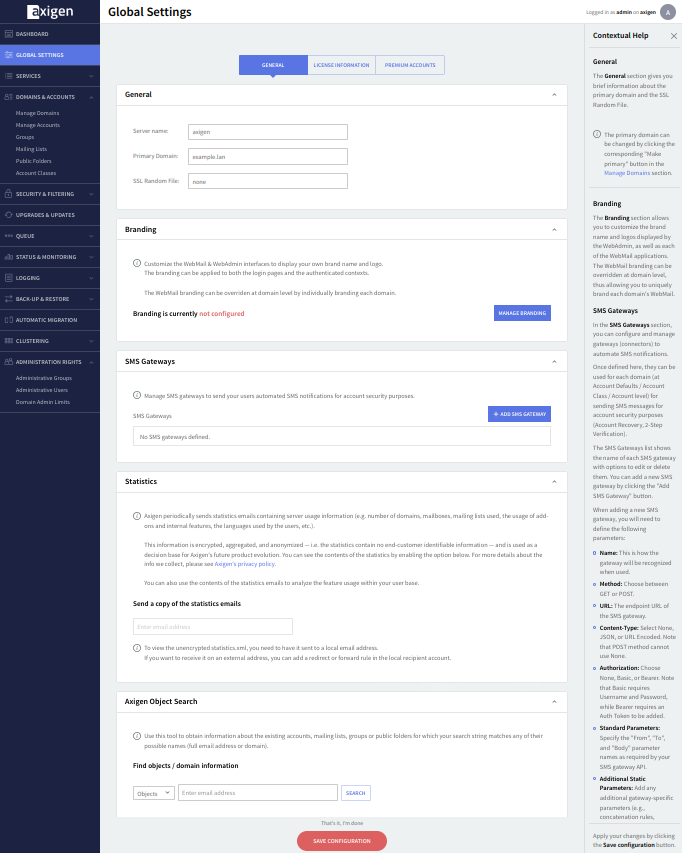 An SMS Gateway is a new Axigen configuration entity that enables the Axigen mail server to connect to an external SMS Connector via HTTP in order to send SMS messages.