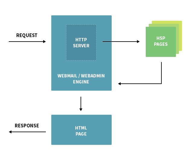 WebMail and WebAdmin content is stored in .hsp type files on the machine where Axigen was installed. The files for each module are stored at the location indicated by the corresponding ‘path’ parameter, found in the WebMail and WebAdmin contexts from the Axigen configuration file (axigen.cfg). This parameter can also be edited using other Axigen Administration tools (CLI and WebAdmin). This diagram illustrates a typical Request-Response process involving the Axigen HTTP Server interacting with HSP.
