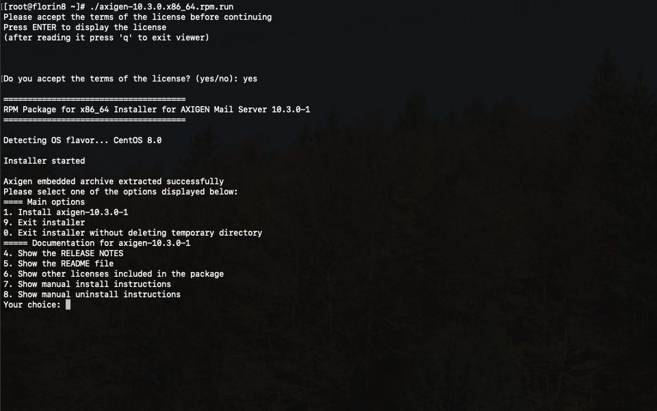 The installation kit consists of a self-extracting shell script which contains an embedded archive with the Axigen package specific to the platform and OS flavor that you have downloaded it for. An additional installation script which runs automatically is also embedded in the self-extracting shell script.