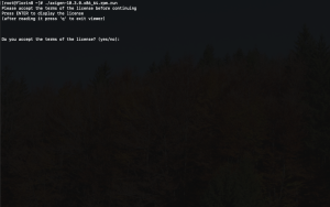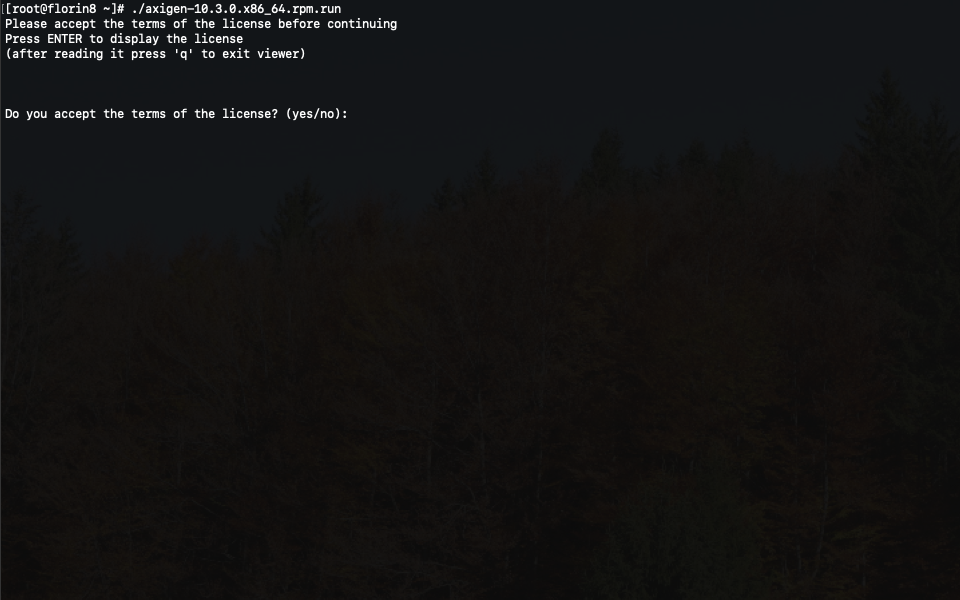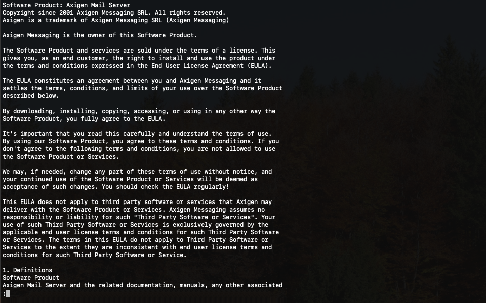 The Axigen license will be displayed using the "less" or "more" pager application, whichever is found on the system. To quit the pager application, after reading the license, the "q" key must be pressed. The license has to be accepted, in order to continue with installation, by typing "yes", when the wizard asks for it.
