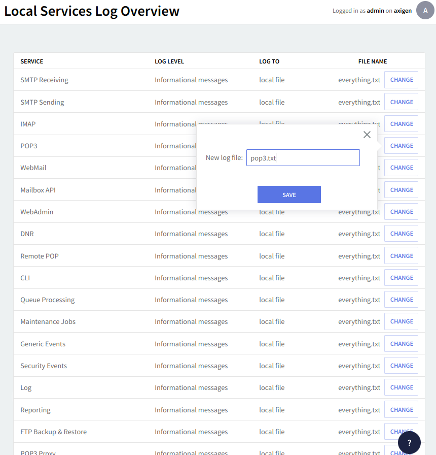 For each Axigen module information messages related to the processed data and connections are stored by default under the "everything.txt" file. To change the implicit location of the file click the "Change" button, then fill in the new file name and click on "Save".