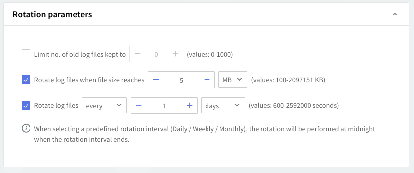 In the "Rotation parameters" section options such as destination file size, maximum lifetime for the destination file, and also the limit number of old log files kept can be defined. To enable any of these options check the boxes in front of them, then use the up and down arrows to set their specific values. Note that the default setting for the "Limit no. of old log files kept to" option indicates that all old rotated log files will be kept.