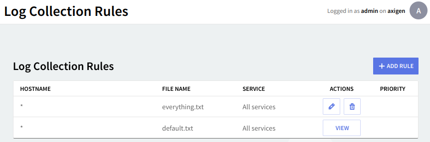When accessing this page, a list of the already defined log collection rules will be displayed. To edit one of the rules use the "Edit" button available on the right side of the rule in question, to delete it use its corresponding "Delete" button.