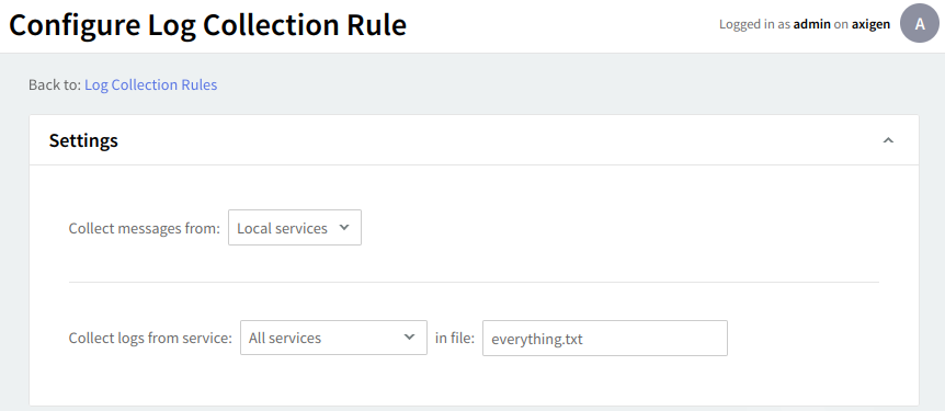 To go back to the "Log Collection Rules" tab, click the "Back to: Log Collection Rules" link available in the top left corner of this page.