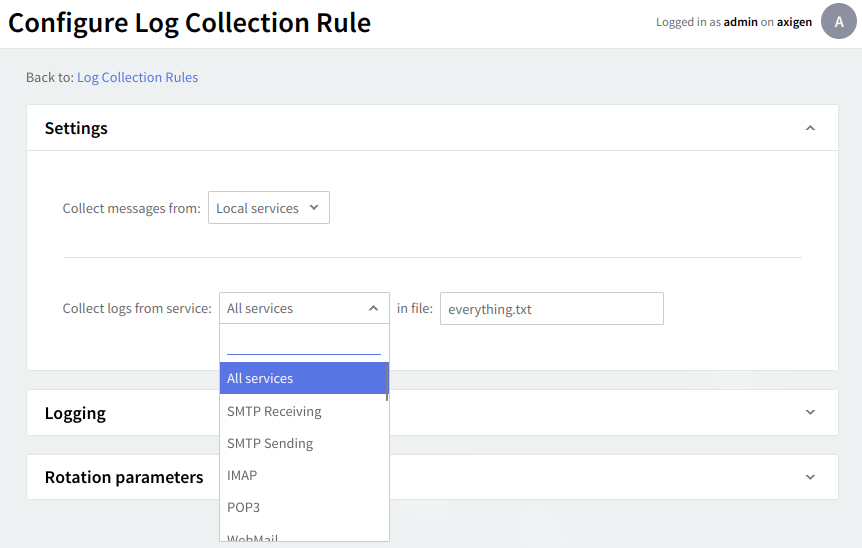 The "Log Collection Rules" → "Configure Log Collection Rule" page contains the parameters relative to the configuration of new log collection rules including the services for which logs are to be created, log levels, and rotation criteria.