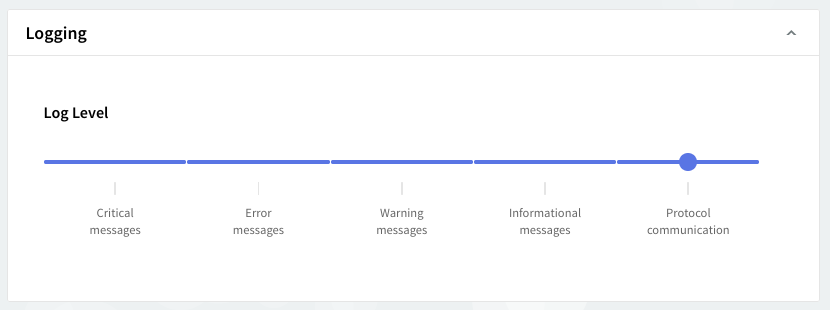 The log level can be set in the Logging section with the use of the slider, by moving it to the left or to the right, based on how detailed the logged information should be. The selected types of messages will change color from gray to blue.