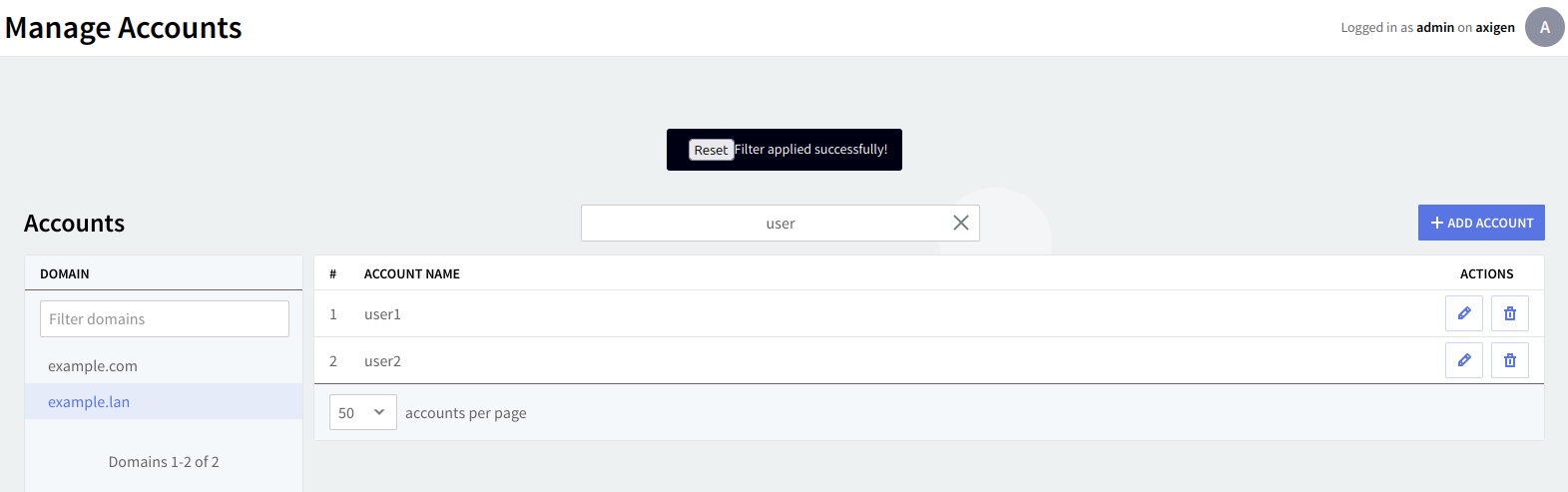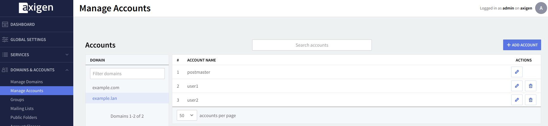 After selecting a certain domain, the list of previously created accounts is displayed. To run a search for a specific account use the "Account Search" field.
