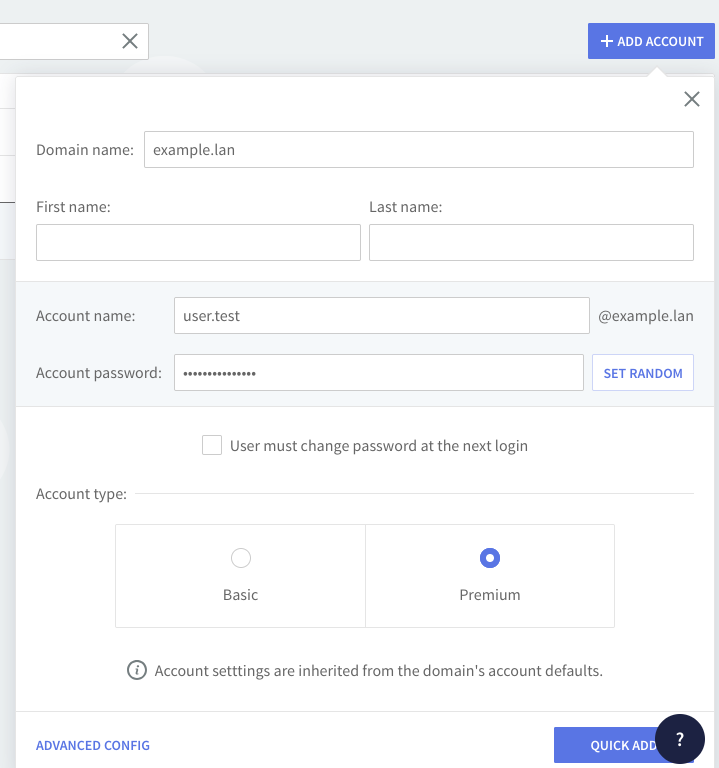The domain you are creating the account in is displayed in the "Domain name" field if you have already selected a certain domain. If you press the "Add Account" button before the domain selection you will have to type the desired domain. Specify a name for the account you are creating in the "Account Name" text field. Type a password of choice in the "Account password" text field or click the "Set Random" button to select a random password combination. When using this button the randomly assigned password is displayed under it.