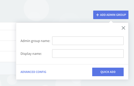 To define a new administrative group, hit the "Add administrative group" button, fill in the group name, and display name in the corresponding text boxes. Use the "Quick Add" option to save the details directly or click on "Advanced config" to further tune it: choose its membership hierarchy and assign the permissions you want the group to have.