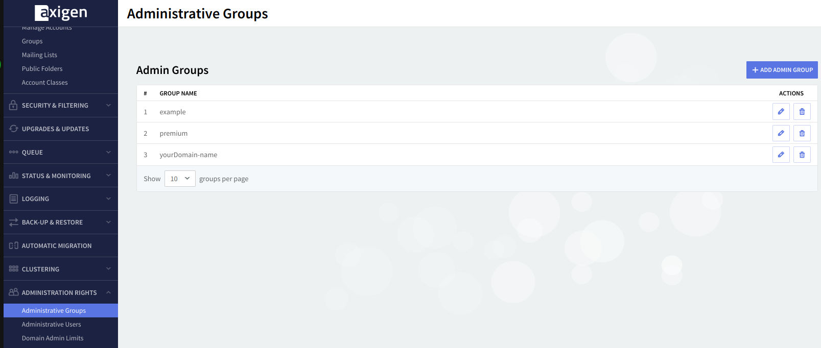 Groups are listed in alphabetical order to ease the search and editing of a specific group. To edit/delete an existing administrative group use the "Edit" and "Delete" options available under "Actions", on the right-hand side of the group in question.