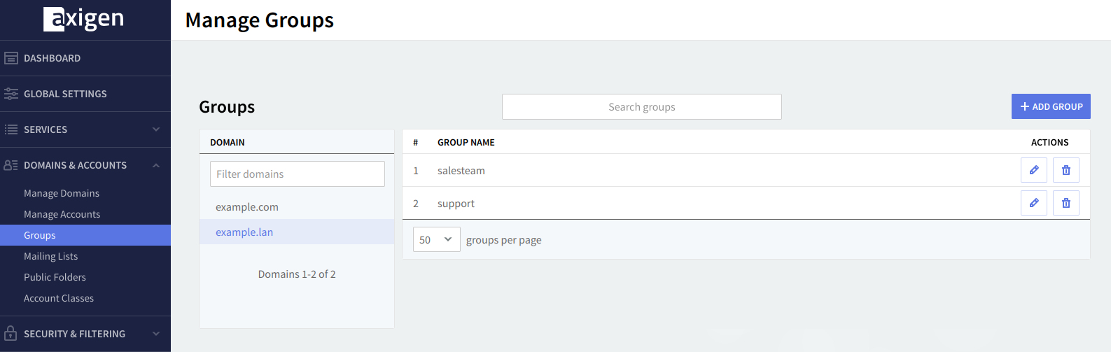 To edit an existing group use its corresponding "Edit" button, to delete it click the "Delete" button. In order to create a new group, click the "Add Group" button.