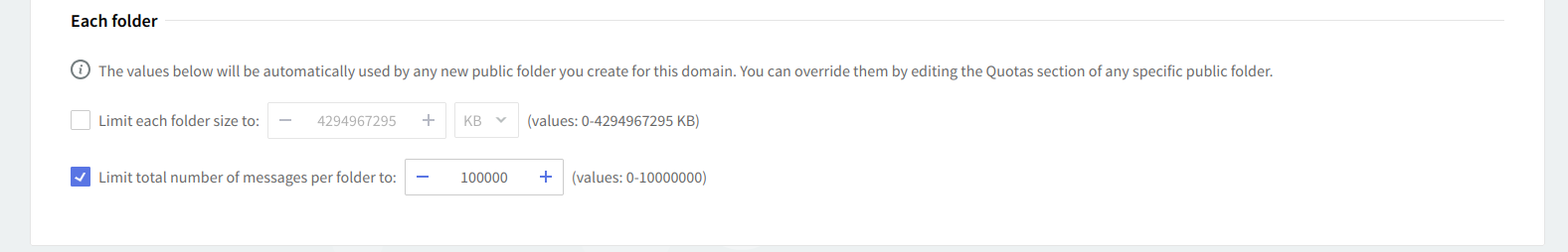 In this section, you can set the maximum size occupied by all the public folders, the maximum number of allowed folders, and the maximum number of allowed messages in all public folders.