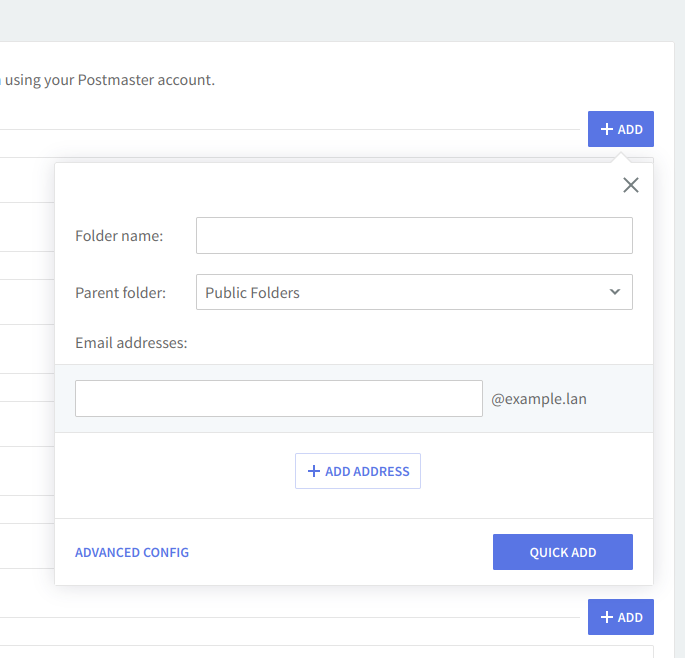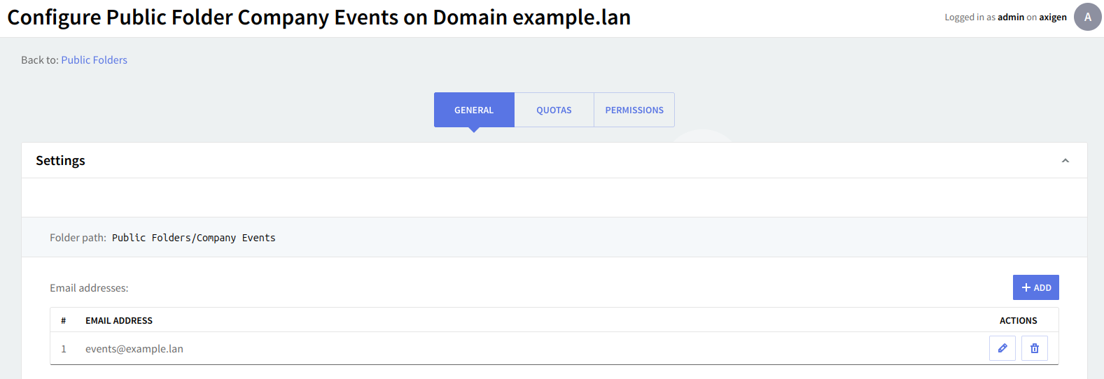 In Axigen, each public folder can have a number of public folder recipients — i.e. associated email addresses that can be used to receive emails into that public folder.