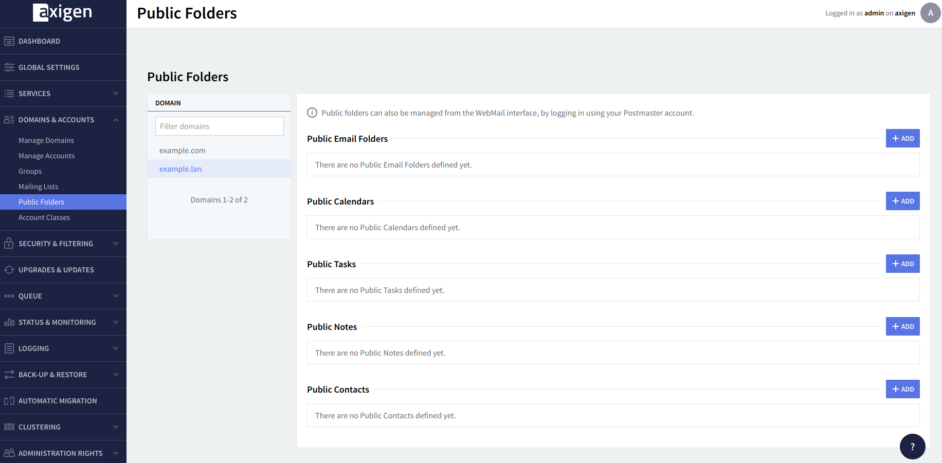 To begin the setup of public folders, go to the Axigen WebAdmin and select the Public Folders option under Domains & Accounts. You will see the currently existing public folders and sub-folders, grouped by type.