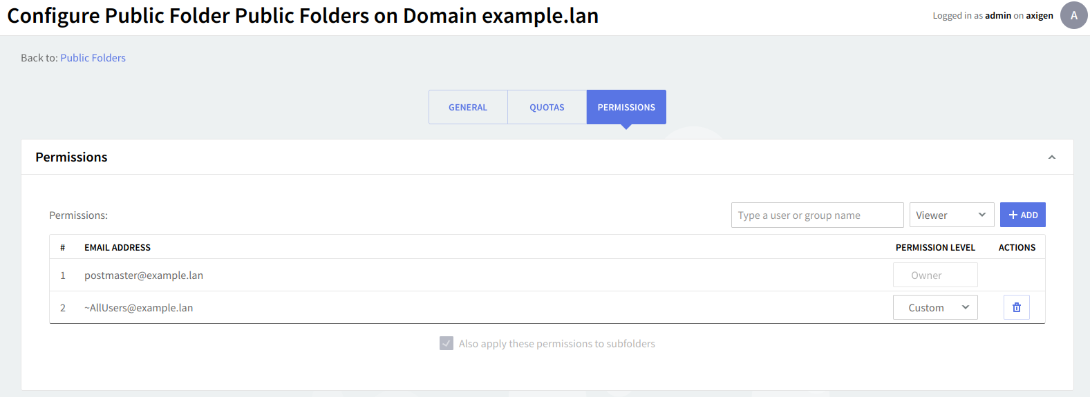 When pressing the "Edit" button for an existing public folder or the "Advanced Config" link when creating it, you will be able to make more settings in the "General", "Quotas", and "Permissions" pages.