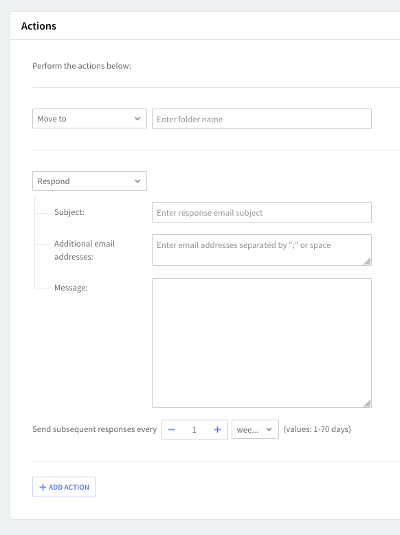To add a new action, click on the "Add Action" button and then fill in all the corresponding details in the newly-displayed menus. To delete an action hit the trash-bin-shaped like button displayed on the right-hand side of the action in question.