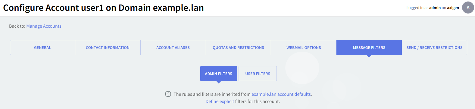 Admin Filters – containing the parameters relative to incoming message rules and filters.