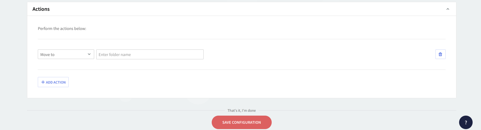 To add a new action, click on the "Add Action" button and then fill in all the corresponding details in the newly-displayed menus. To delete an action hit the trash-bin-shaped like button displayed on the right-hand side of the action in question.