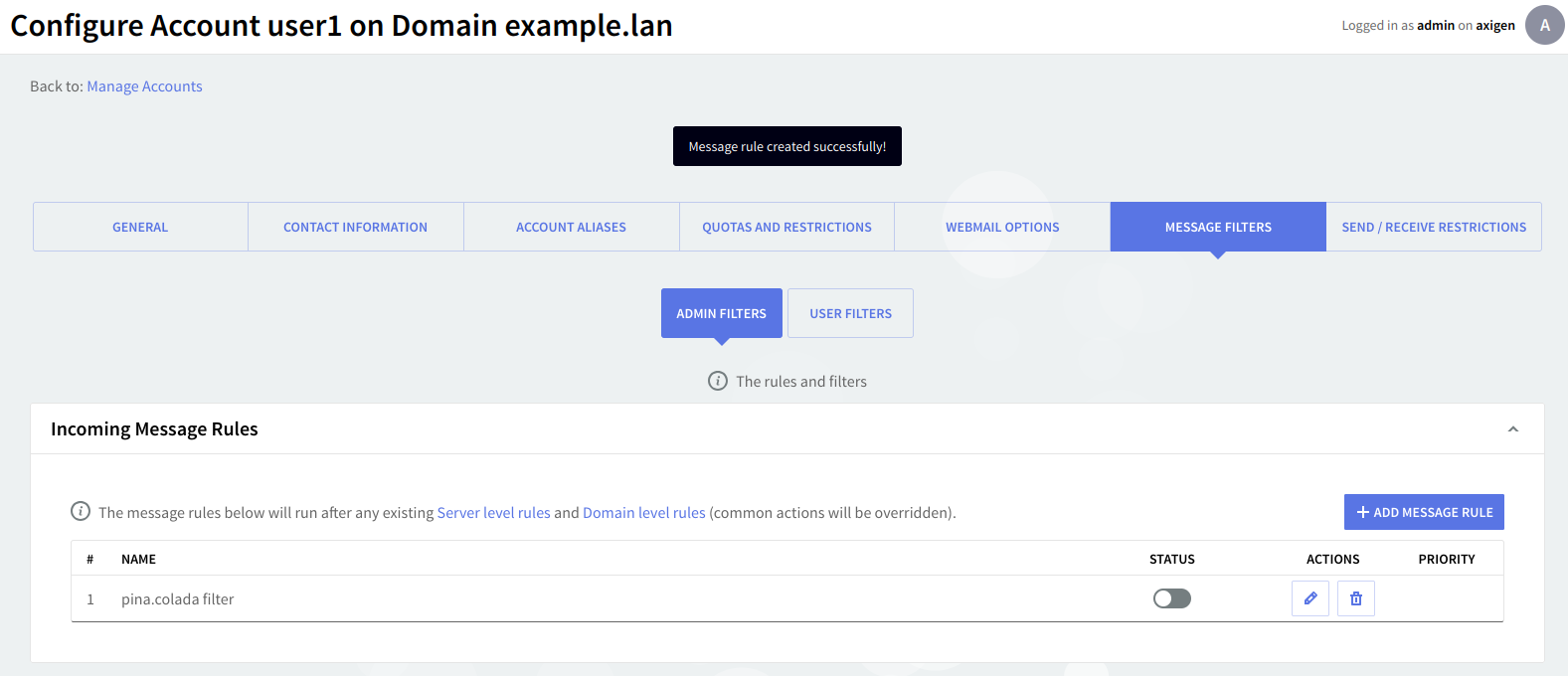 The "Message Filters" → "Admin Filters" sub-page enables you to configure incoming message rules and filters for the edited account. Filters defined in this section will not appear in the user's WebMail filters list and as such cannot be edited by the user.