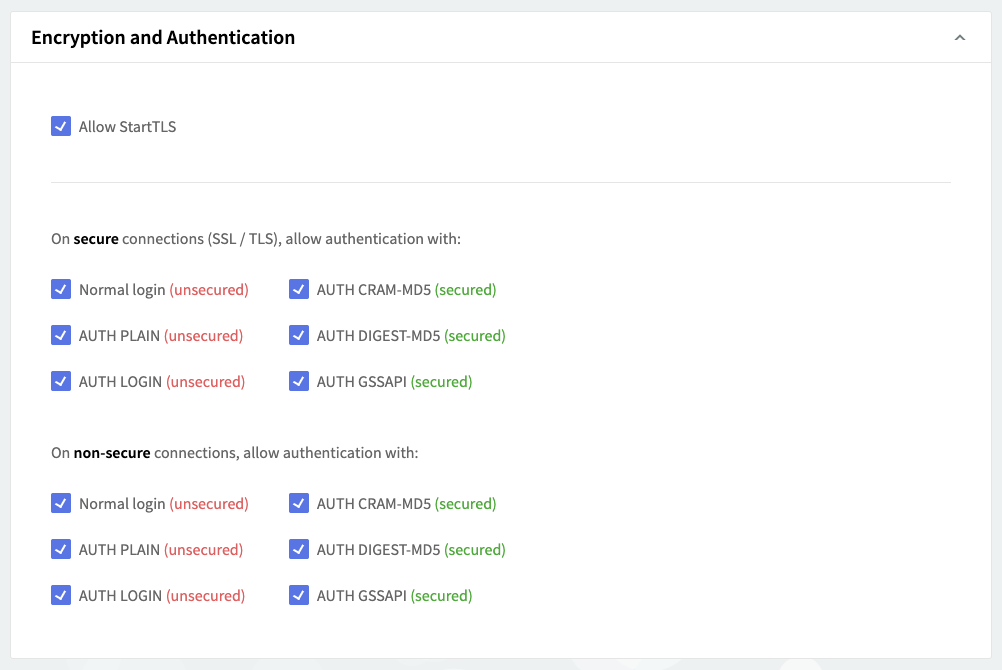 To allow plain login for the Axigen IMAP service, go to WebAdmin → Services → IMAP, scroll down to "Encryption and Authentication" and apply the configurations shown below: