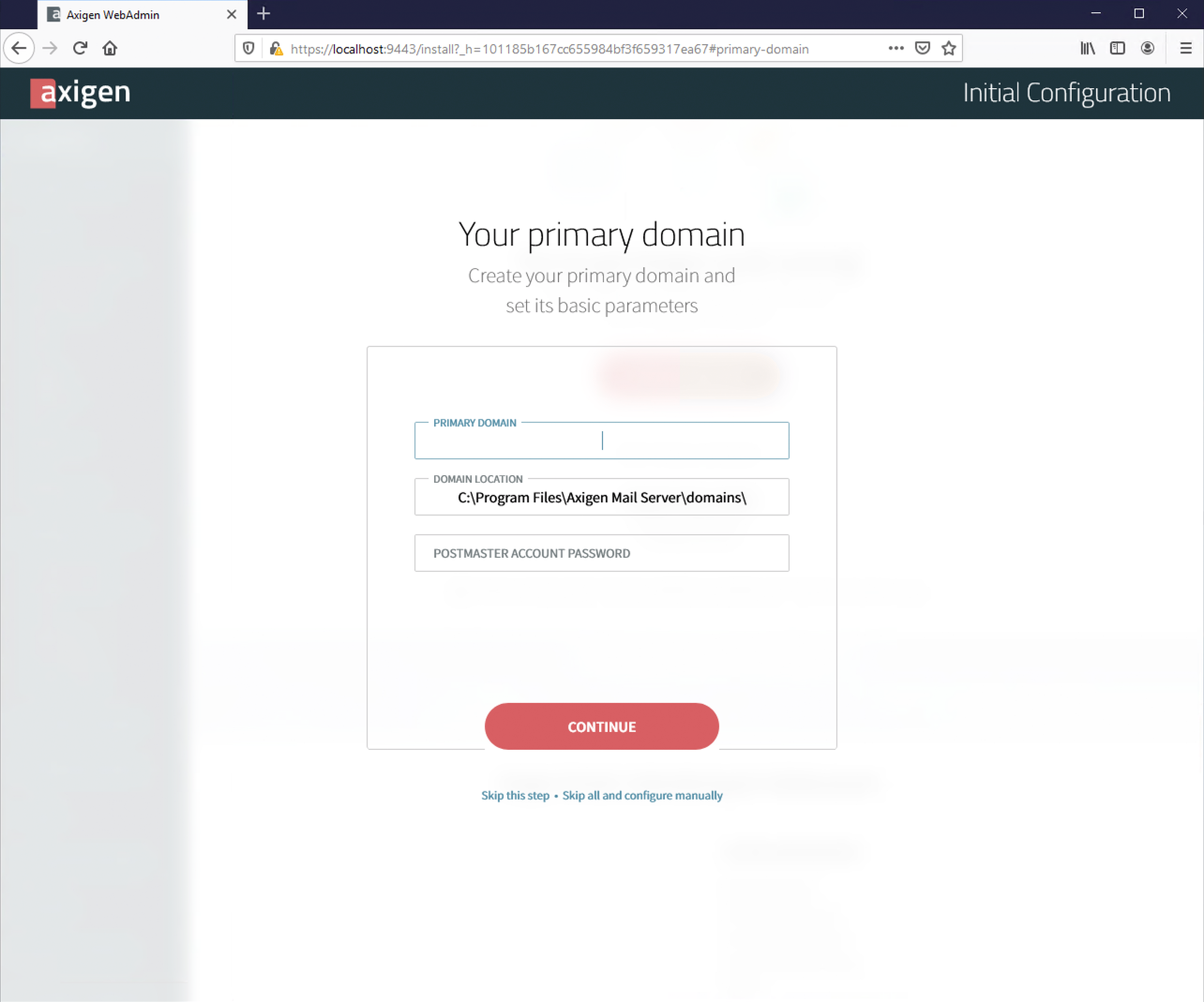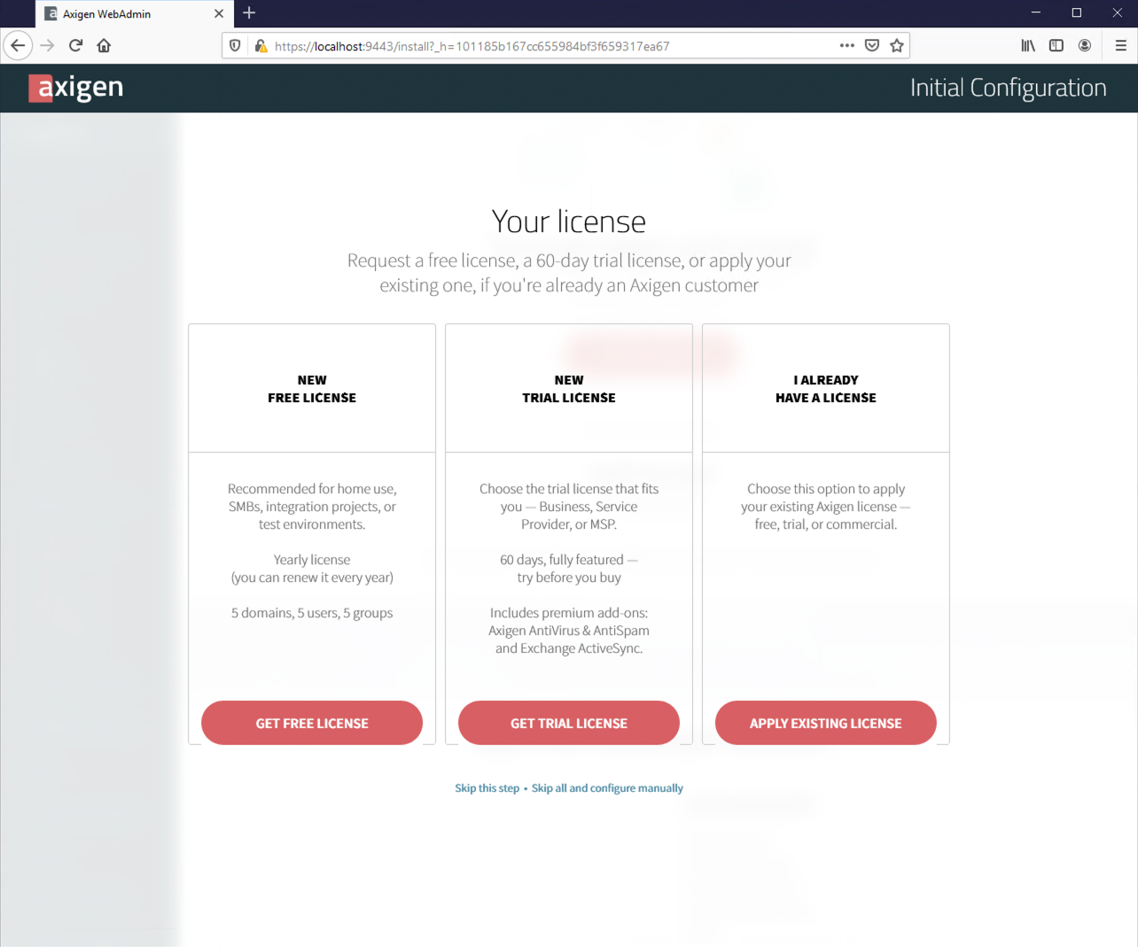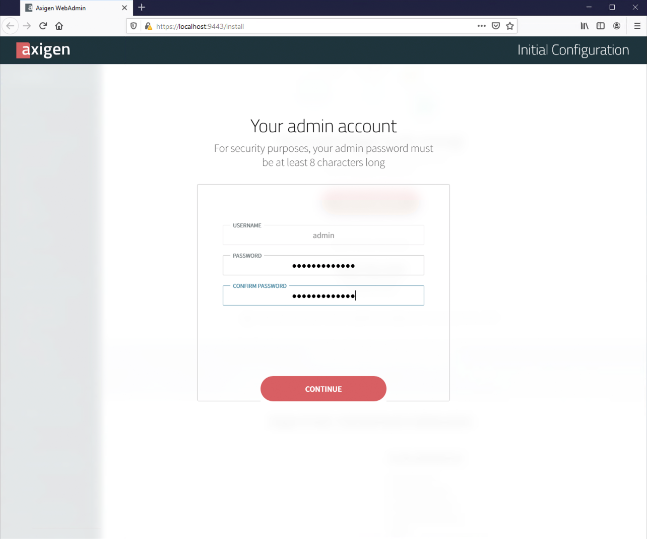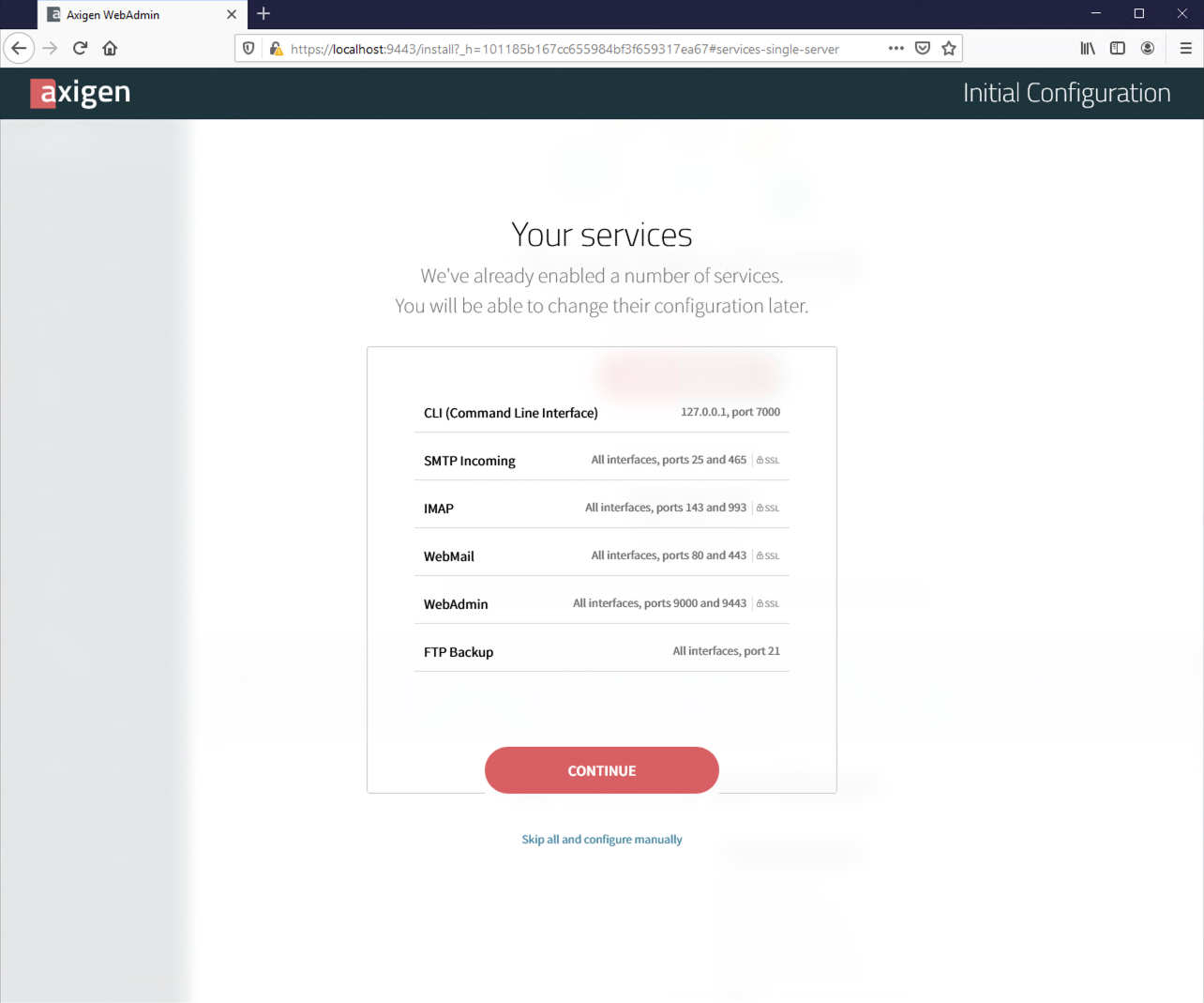 After a fresh install, Axigen needs admin users to open a browser window and connect to the Axigen WebAdmin.