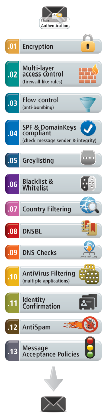 You can configure and implement message acceptance policies and adjust them to best suit your company's security requirements. Incoming connections established via SMTP and the message flow can be easily managed using the established policies.