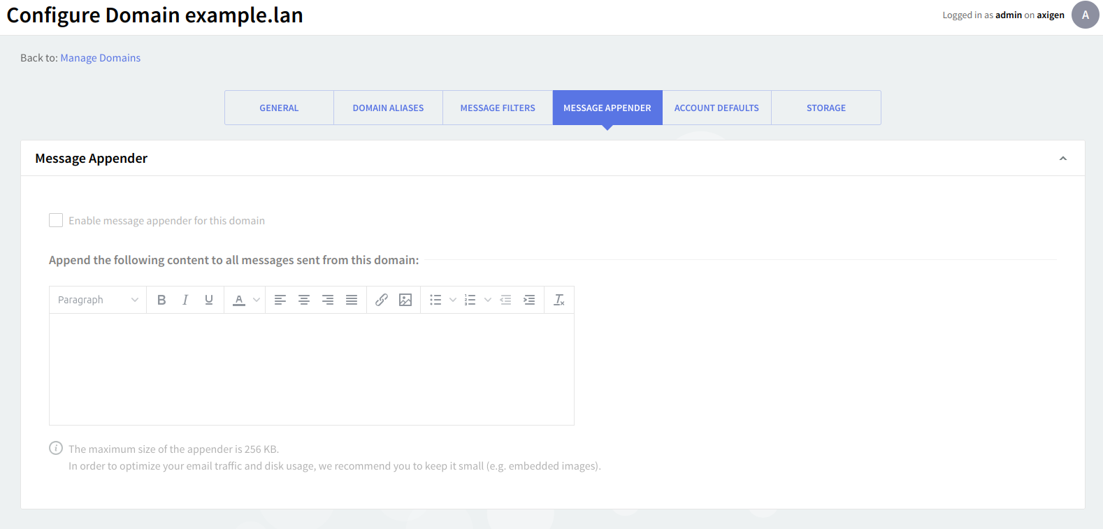 The "Manage Domains" → "Message Appender" page allows you to create an appender that will be attached to all messages sent by the respective domain's users.
