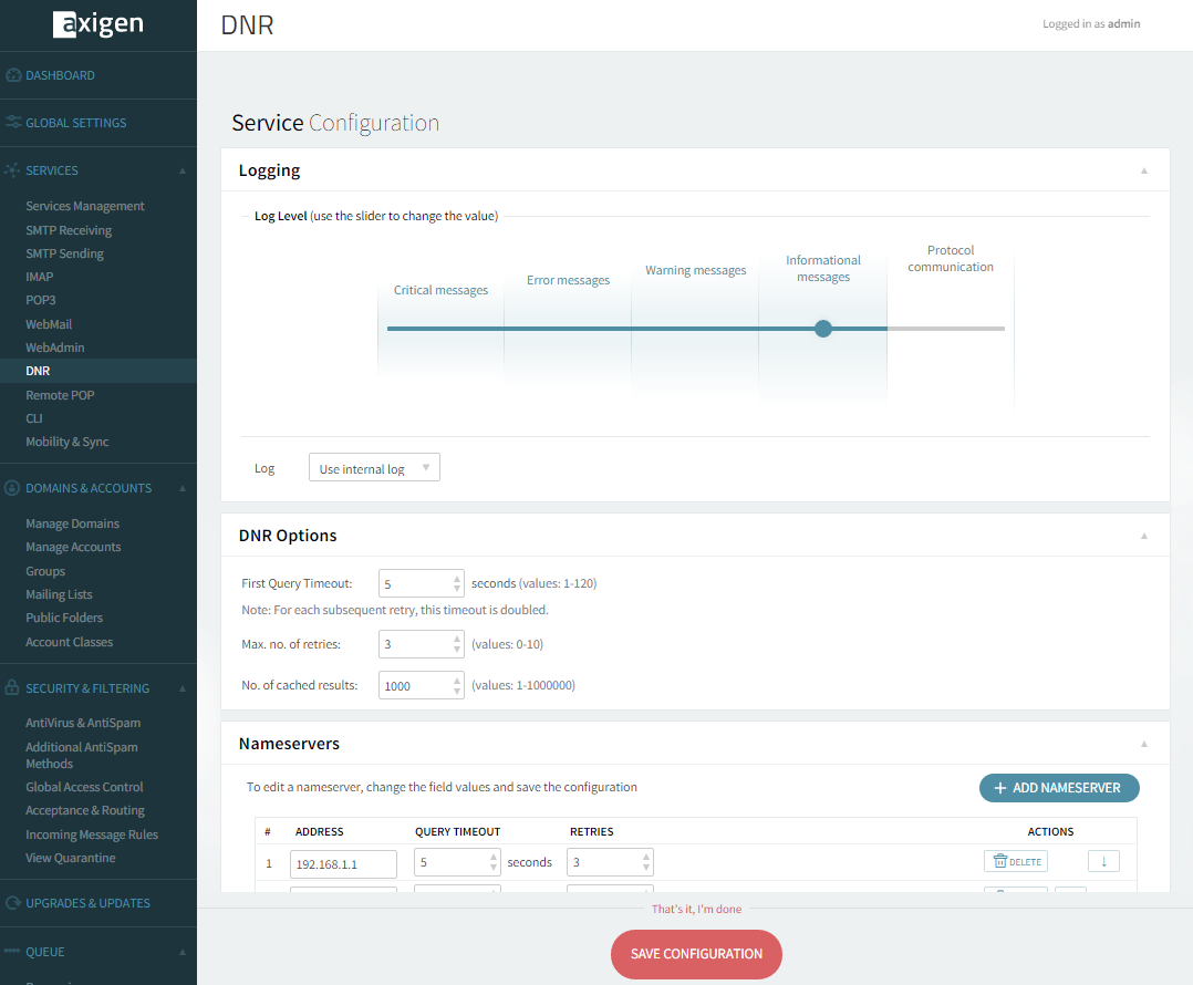 In order to be able to send emails out, Axigen will need to have at least one DNS server configured in WebAdmin in the Services → DNR Service Configuration.