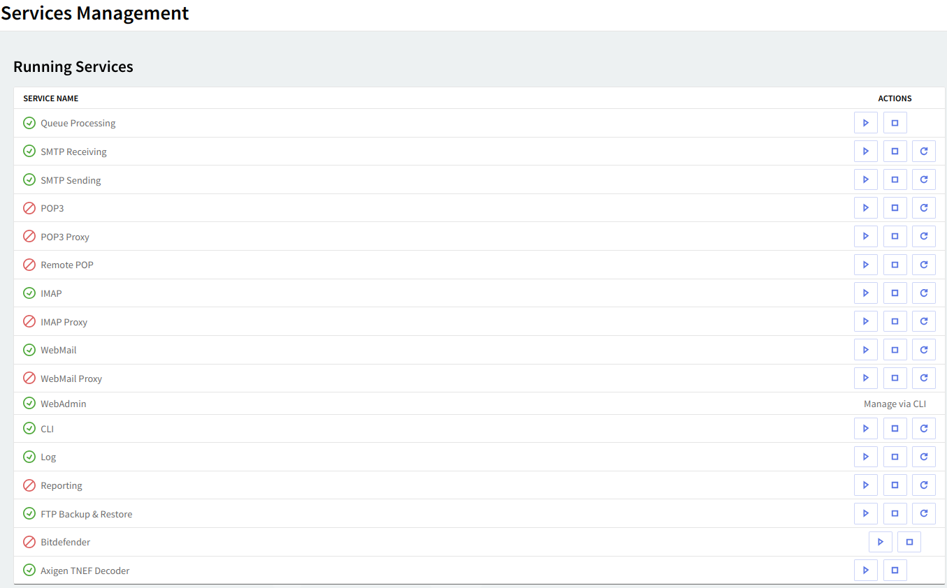 For instance, services like "Queue Processing" and "SMTP Receiving" are currently running, while "POP3" and "WebMail Proxy" are stopped. Administrators can use this interface to manage services by starting, stopping, or restarting them as required.