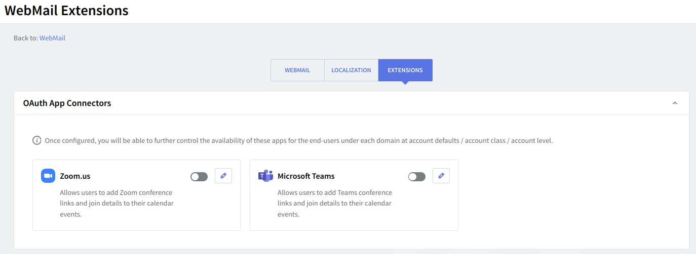 Under the OAuth App Connectors section, administrators can configure third-party applications like Zoom and Microsoft Teams for integration with the WebMail interface. These apps can only be added to users' calendar events after they have been fully configured and enabled by an administrator.