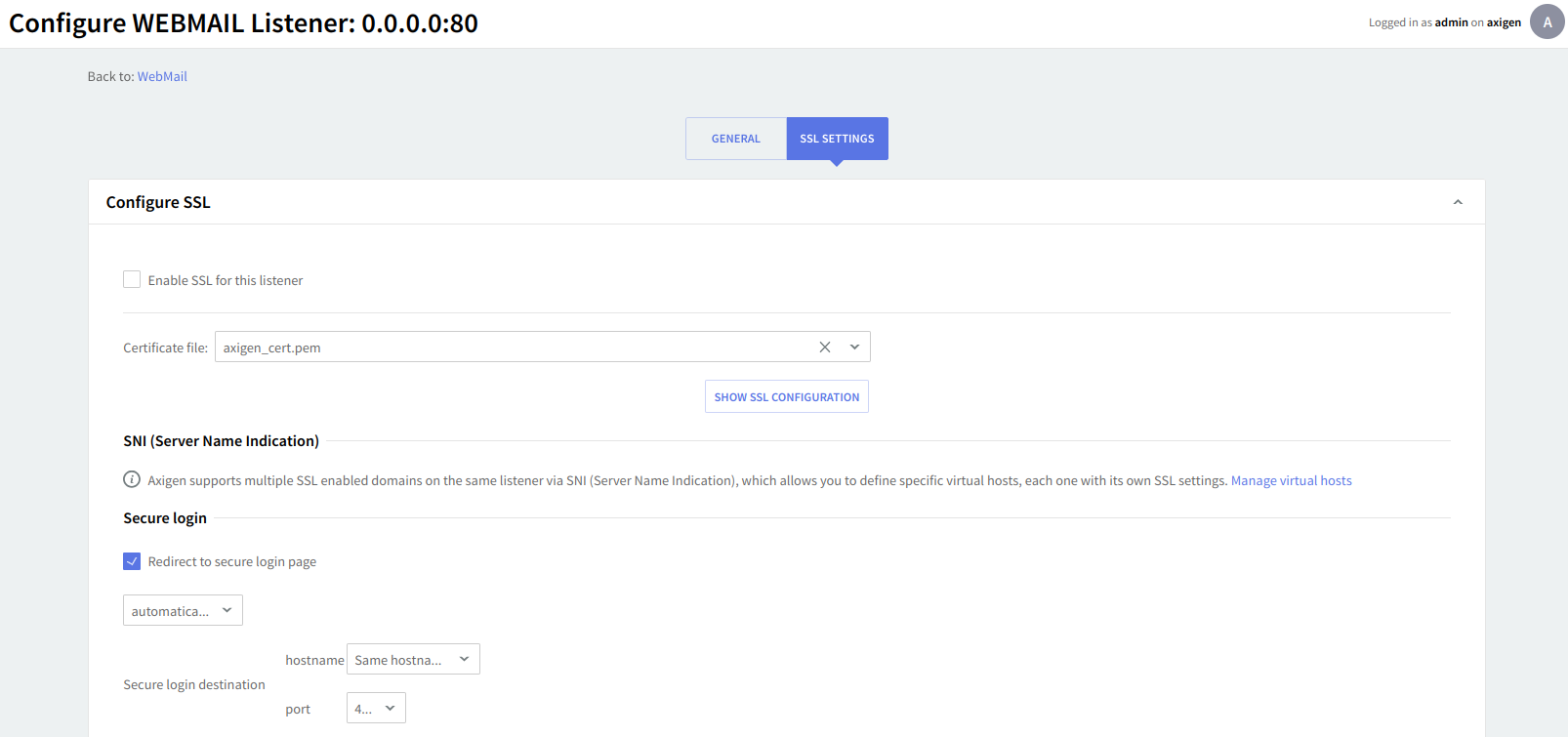 Specific to the WebMail and WebAdmin listeners is the "Secure login" section available in the Listener configuration edit → "SSL Settings" tab.