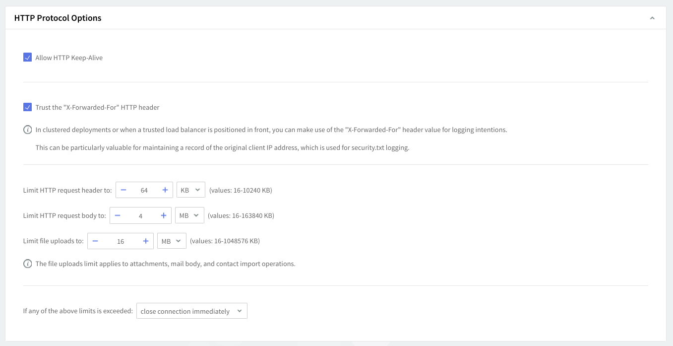 Next, you can set the HTTP limits for WebMail requests. Use the "Limit HTTP Request" header to option to specify the maximum allowed size for incoming HTTP headers, and the "Limit HTTP Request" body to option to specify the maximum allowed size for incoming HTTP body. The third option, "Limit file uploads", can be used to set the maximum allowed size for incoming upload data. It applies to attachments, mail body, and contact import operations. All size values can be set by using the up and down arrows, in KB or MB and only for the "Limit file uploads" option in GB.