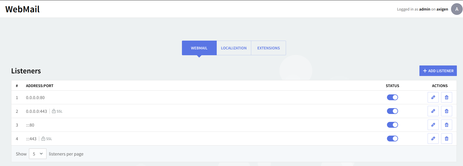 The first section in the WebMail tab is "Listeners". You can add, delete, or edit the TCP socket listeners for the WebMail service.