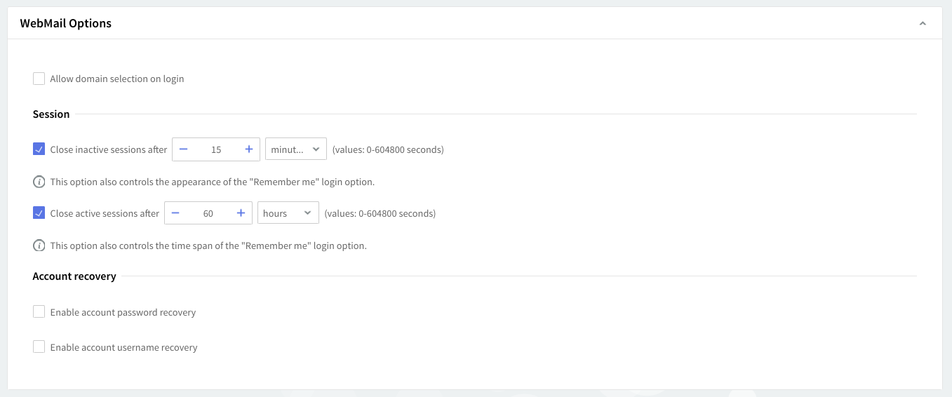 Set the parameters for WebMail sessions by using the two options in the Session section. You can specify after what interval an inactive (idle) / active WebMail session is closed. Values for these parameters can be entered in seconds, minutes, hours, or days, by using the up and down arrows.