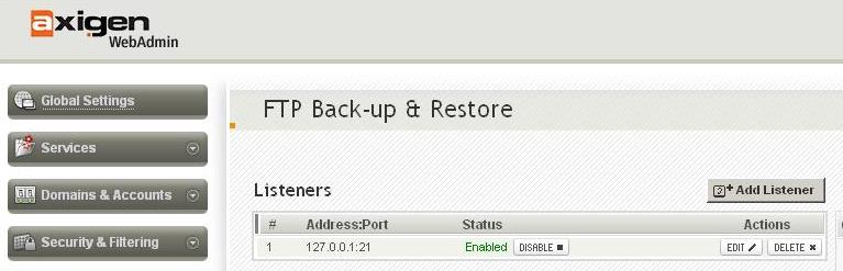 2. If the connection is refused, most probably the Axigen's FTP listener is setup to listen for connections only on the loopback interface (127.0.0.1). In order to change the FTP Listener to accept connections from all interfaces click "Edit" for the listener. (this is done via Webadmin -> Back-up & Restore context).