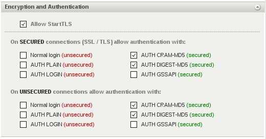 SquirrelMail also supports CRAM-MD5 and DIGEST-MD5. To ensure that, if you switch to other authentication types in the SquirrelMAil configuration, there will not be inconsistencies with the allowed Axigen IMAP authentication methods, you can enable the Normal, CRAM-MD5 and DIGEST-MD5 in the Axigen IMAP service settings.